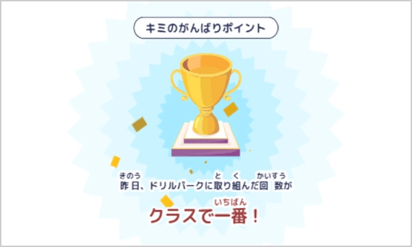ミライシードの複合的な学習データから、子どもごとの強みやがんばりを毎日表示。称賛され、自信につながります。