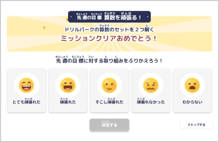 週の初めに目標を立て、ミライシードで学習に取り組み、翌週のはじめにふりかえり。目的を持って学習し、ふりかえることを繰り返していくうちに、日々の取り組みが自己調整学習につながります。
