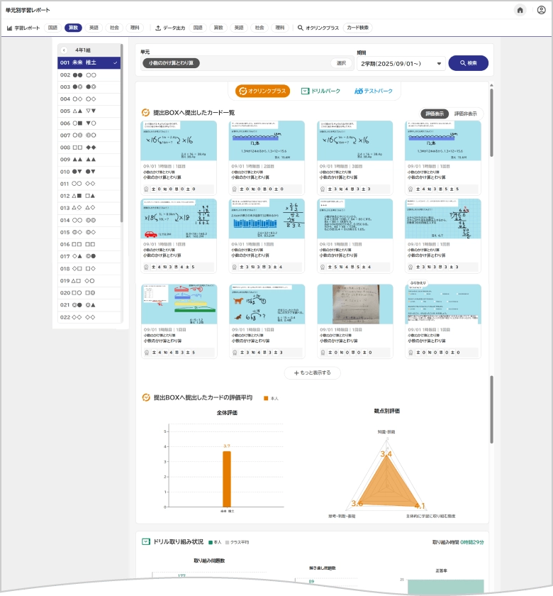 児童生徒一人ひとりのオクリンクプラス・ドリルパーク・テストパークの学習履歴を一元化。先生用の画面では、オクリンクプラスのカードに着けた評価の平均も表示され、単元の学習状況を多面的に把握できます。