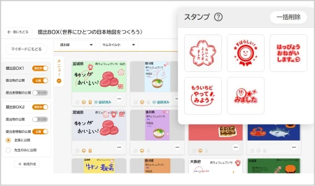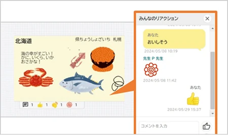 みんなのボードでは、個人の考えをすぐに複数人に共有。コメントやスタンプで相互にリアクションを取り合いながら、共同作業で意見を練り上げることができます。多くの意見に触れながらお互いの考えを磨き上げ、より深い学びと気づきを得ることができます
