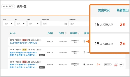 クラス全員の提出物を一覧で管理。提出状況の把握や再提出管理も一目瞭然。