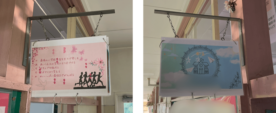 子どもたちから、「学級目標をみんなで作りたい」「紙に書くだけじゃなくて、廊下を通るたびに意識できるよう、看板にしたらどうかな」という声が上がりました。私はそのアイデアを受け、実現しやすい形に整理する役に回りました。話し合った結果、4人1組の計8グループで、オリジナルの学級目標看板を制作することになりました。完成した看板は写真①のように、1か月ごとに順番に掲示しました。「全員が目標づくりに関わる」という思いが、看板という形になり、廊下を通るたびに学級目標を思い出す仕掛けが生まれました。