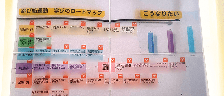 跳び箱運動で子どもたちが気づいたコツを、オクリンクプラスにまとめ、掲示しています。そうすることで、自分の気づきが友達の助けになり、友達の気づきが自分の力になっていきます。こうして学び合うことで、クラス全体の技の完成度が高まっていきます。